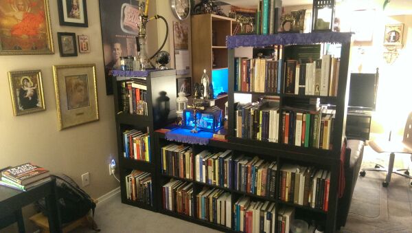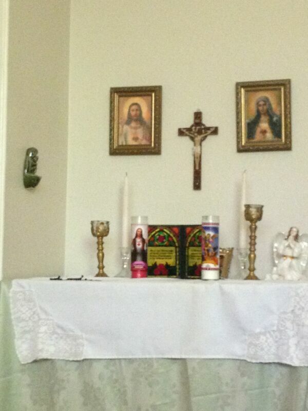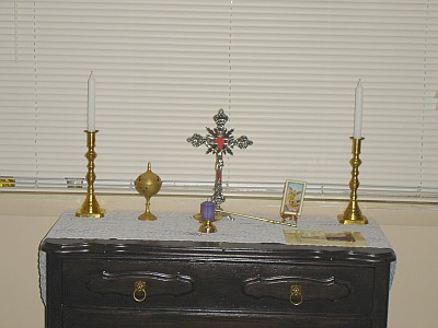 A man named Kyle made the altar above. He desribes it thus: "Theres a Celtic Crucifix, icons of The Sacred and Immaculate Hearts of Jesus and Mary, a holy water font, candles, angel statue and a rosary."