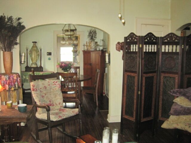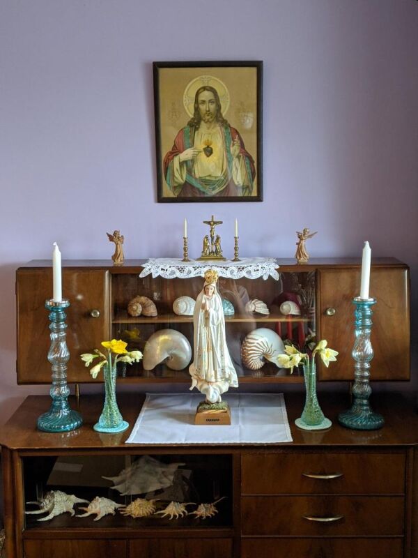 A rosary is kept before Our Lady and a photo of a deceased niece is also shown here.